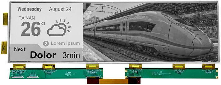 It has 28” active area with 3840 × 1080 pixels, the display is capable to display images at 2-16 gray levels (1-4 bits) depending on the display controller and the associated waveform file.