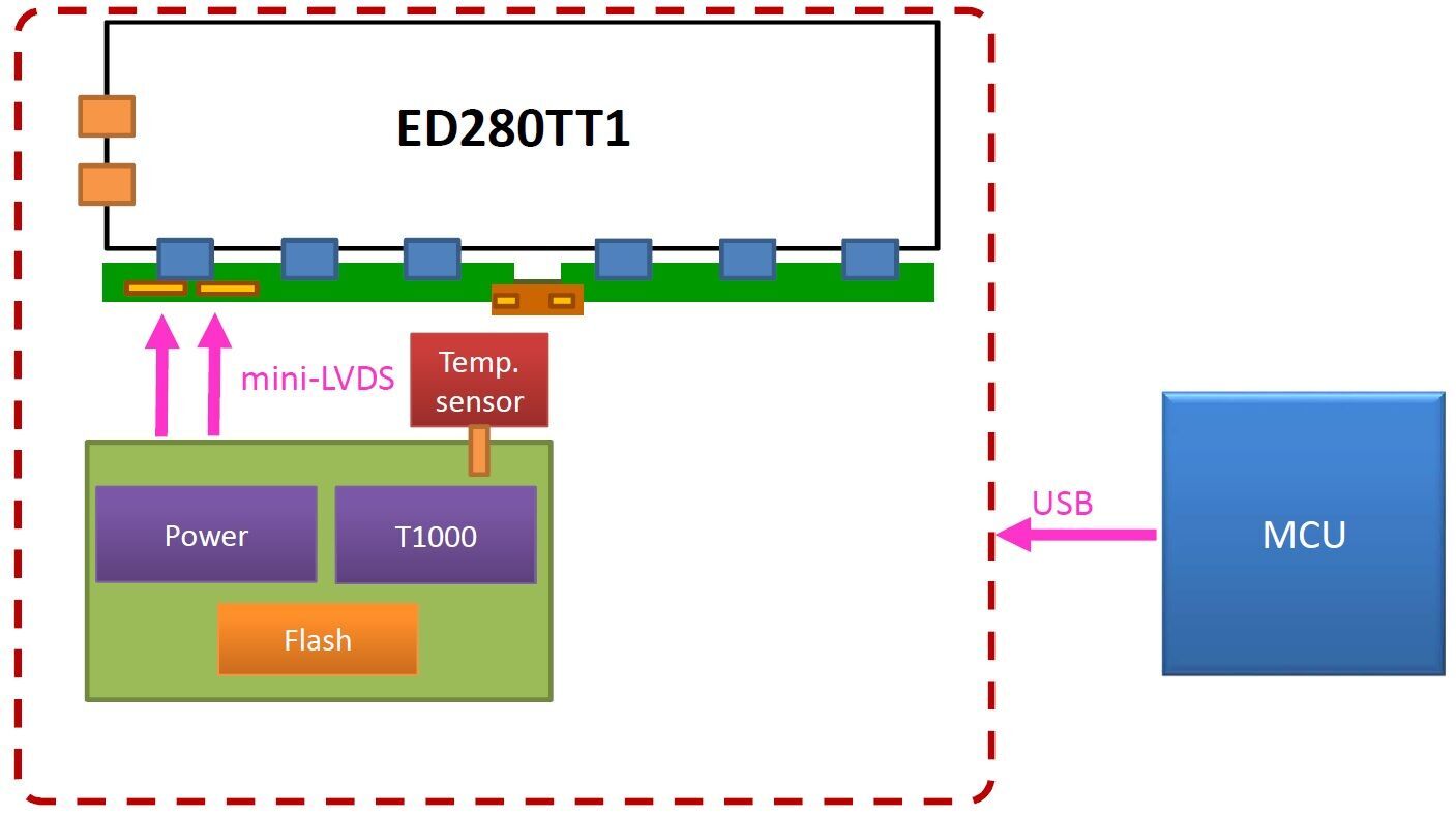 Die Schnittstelle des Panels ist Mini-LVDS. Sie bietet hohe Bandbreiten bei reduzierten Störpegeln, hat einen geringen Leistungsverbrauch und gutes EMV-Verhalten. Zur Ansteuerung des Displays wurde ein TCON-Board mit T1000 IC von E Ink entwickelt. Das Board wird zusammen mit dem Panel angeboten.