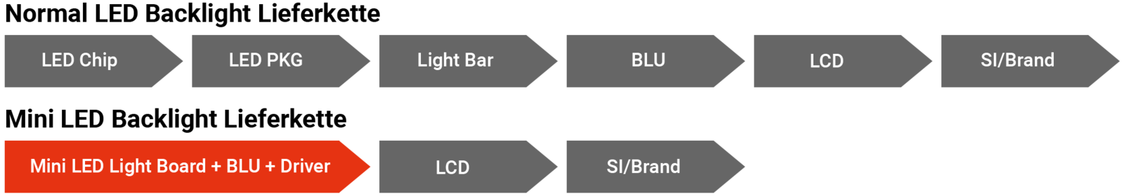 Durch den Einsatz dieser Mini LED Light Boards ergeben sich außerdem Vorteile in der Lieferkette. „Normale“ LED Backlights benötigen viele Komponenten unterschiedlicher Hersteller, wohingegen die Verwendung von Mini LED Light Boards ein "All-in-One" Lösung bietet.