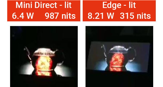 Im direkten Vergleich braucht das „Direct-lit Panel“ auf der linken Seite 6,4 W um 987 cd/m² zu erzeugen, während ein vergleichbares „Edge-lit“ Panel mit 8,2 W nur 315 cd/m² erreicht.